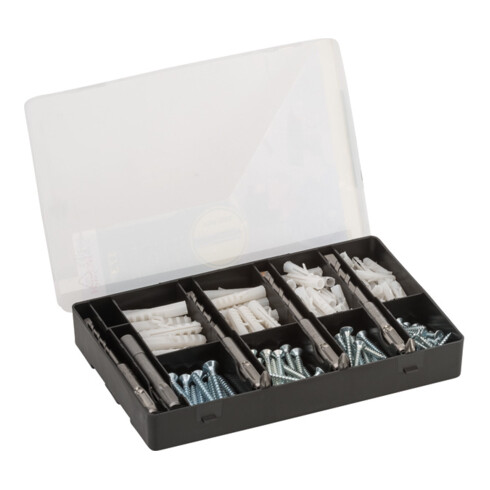 4 punte per pietra SDS-plus 1 bit per giraviti L = 25 mm PZ 2/2/2 75 viti 25 pezzi 3,5 x 30 20 pezzi 4,0 x 35 20 pezzi 4,0 x 40 10 pezzi 5,0 x 50 90 tasselli 30 pezzi Ø 5 mm 25 pezzi Ø 6 mm 20 pezzi Ø 7 mm 15 pezzi Ø 8 mm 1 supporto universale, magnetico