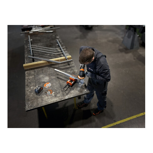 - Smerigliatrice angolare a batteria potente e resistente alla polvere per efficienti lavori di taglio, levigatura e sbavatura durante il montaggio