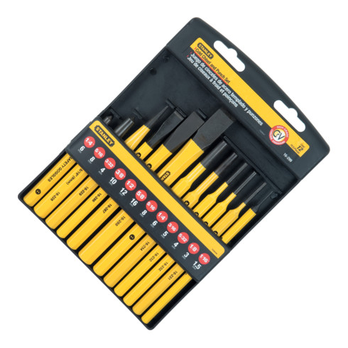Set di punzoni e scalpelli Stanley Set di punzoni e scalpelli, 12 pezzi di Stanley con il numero di articolo: 4-18-299 dalla categoria: Utensili di smontaggio, martelli e utensili a percussione - Utensili a percussione di Stanley con EAN: 3253564182997 - Set di punzoni e scalpelli 12 pezzi. - Scalpelli in acciaio al cromo vanadio - formati in un unico pezzo - Punzoni da centro e punteruoli in acciaio per utensili - formati in un unico pezzo - superfici trattate e verniciate a polvere - per una migliore visibilità e una protezione aggiuntiva - Contenuto del set: Punteruoli da centro: 1,5 mm, 3 mm, 4 mm, 5 mm, 6 mm, 8 mm Punteruoli da centro: 6 mm, 8 mm Punteruoli passanti: 2 mm Scalpelli piatti di precisione: 10 mm, 12 mm, 16 mm Caratteristiche principali Set di punteruoli da centro e passanti per scalpelli Design 12.., Punzone, punzone centrale